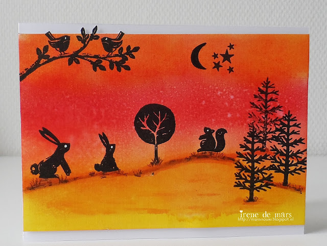 Heel mooi die warm gekleurde achtergrond met die silhouet-stempels gecombineerd Irene. Je hebt er een lief tafereeltje van gemaakt. Gefeliciteerd met je toppertje, dik verdiend in mijn ogen.