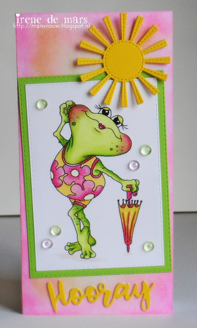 Ter verhoging van de pret heb ik er een sliderkaart van gemaakt en dat was een heel gedoe want ondanks dat ik het vliegtuigje 3x had uitgeknipt was het een veel te slappe bedoening om het te laten glijden....grrrrrrr. Dus nog 1 x uitgeknipt (gelukkig heel veel velletjes in het blad!) en op stevige cardstock geplakt en het daarna uitgeknipt en alleen de propellor, het hoofdje en de bril als 3D...BINGO hihi!